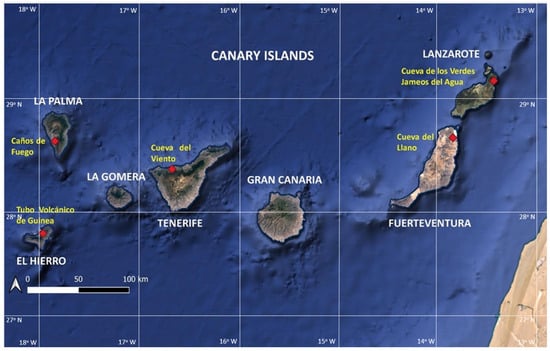 Numerous volcanic cavities or volcanic tubes have been identified in the Canary Islands as a result of the intense volcanic activity of the islands since their formation 20 million years ago []. Of these, only the following are currently exploited as tourist caves: Cueva del Llano (Fuerteventura island), Cueva de Los Verdes and Jameos del Agua in Lanzarote, Cueva del Viento (Tenerife island), Caños de Fuego (La Palma island), and Tubo Volcánico de Guinea (El Hierro island) (Figure 1).