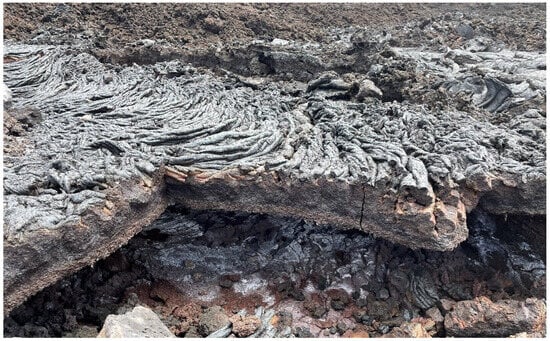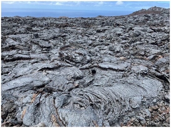 In terms of the morphology and structure, two basic types of basaltic lavas or flows exist: ‘aa’ or scoriaceous lavas and ‘pahoehoe’ lavas []. Lavas with properties intermediate between these two types are called transitional lavas. The ‘pahoehoe’ lavas are more fluid than the ‘aa’ lavas, and when they cool and solidify, the surfaces are not scoriaceous but smooth, lobular, or cordate in shape (Figure 2). Their interior structure is also different, presenting a very porous or spongy texture, a product of the small molds left in the rock by the numerous vacuoles, more or less spherical, of the gas contained in the lava [].