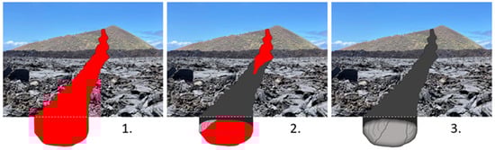 The formation of a volcanic tube can be summarized in three stages, as shown in Figure 4: (1) There is a continuous flow for a long period of time of a ‘pahoehoe’ basaltic lava [], in such a way that the flow is channeled by the formation of solid edges on both sides of the flow, due to the cooling of the lava in contact with the air []. (2) These edges grow as a result of lava splashes and form true walls of solidified lava that form the walls of the channel, while inside the channel, lava continues to flow; the surface also cools and solidifies on contact with the air, forming a rocky crust that will be the roof of the tube. (3) This crust will gradually thicken until it gives rise to a true slab of rock, which rests on the walls of the channel and which will form the roof or vault of the volcanic tube. When the lava flow ceases, the inside of the channel empties down the slope, creating the volcanic tube.