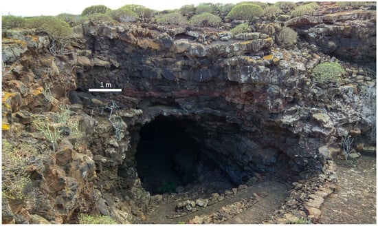The Guinea Volcanic Tube on the island of El Hierro is a small gallery of about 100 m in length, the product of basaltic lava flows emitted by the El Golfo infill volcanism approximately 15,000 years ago []. All its extensions can be visited.