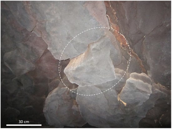 The confluence of the families of vertical retraction joints, with the horizontal joints of the contacts between the tabular lava levels, isolates blocks with shapes tending to hexagonal prisms that can also become detached (Figure 6). This meso-scale instability is caused by detachment or a loss of block support [], as a consequence of one or more factors, such as (a) alteration of the block faces by fluid circulation, (b) convergent movements of the cavity due to the effect of gravity and the weight of materials on the vault, and (c) external factors such as seismic movements, and the dragging of soil and rock masses into the cavity.