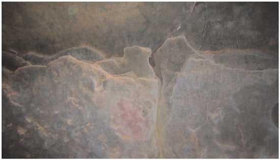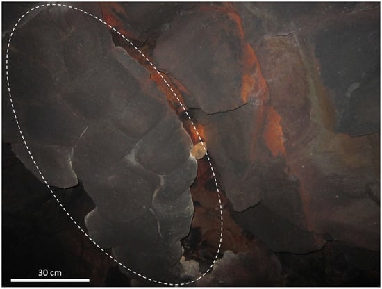 Another type of meso-scale instability common in volcanic tubes is centimeter-spaced flaking, with joints parallel to the inner arc of the vault, which favors the formation of slabs that can detach [] (Figure 8).