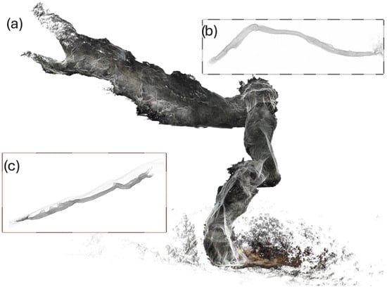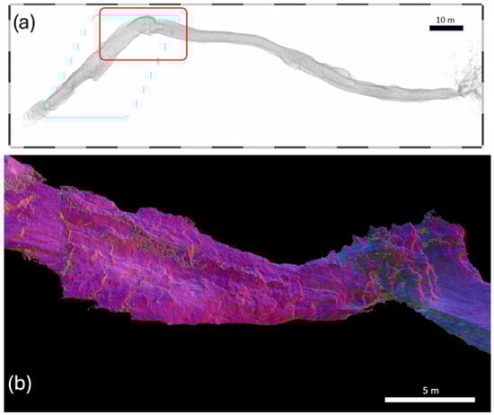 This involves projecting the instabilities identified in the geological–geotechnical survey onto the topographic base obtained, in order to locate them and monitor their evolution each time the cavity is rescanned. This technique is eye-catching, so it can be shown to visitors as an additional attraction of the visit to the cave [].