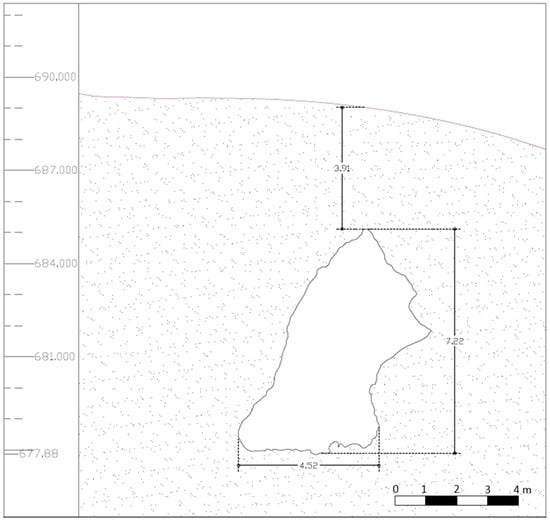 Studies of the structural stability of volcanic cavities are based on whether the characteristics of the rock mass allow the cavity to remain stable. This depends on several factors: the properties of the rock mass, the span or width of the cavity, the type of excavation, and the method of excavation []. The present case is different, as the cavity has not been excavated but formed by natural processes; so, the approach was reduced to the analysis of two factors: the morphology and dimensions of the cavity and the geomechanical conditions of the rock mass.