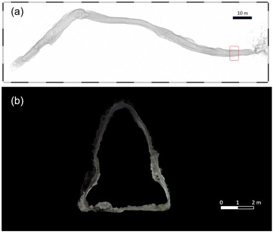 A detailed field inspection of the cavity should be conducted along its length, in order to determine the interior and exterior outcropping materials and detail its dimensions []. Based on a geological–geomorphological mapping of the gallery, the different genetic units that have given rise to the current configuration of the cavity’s galleries must be distinguished.