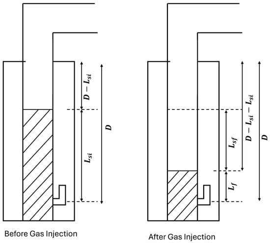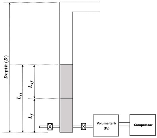 Schematic diagram of an intermittent gas lift well before and after gas injection for modeling the liquid fallback [12].