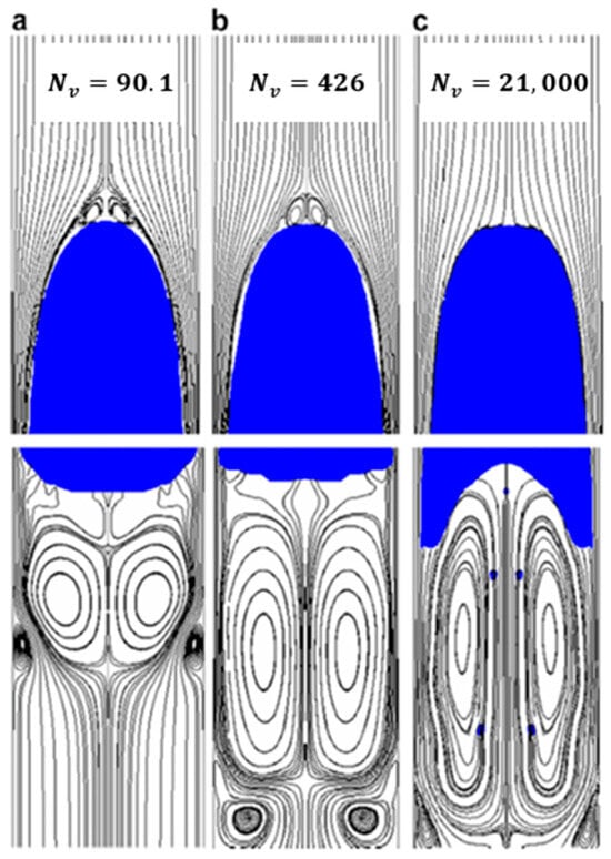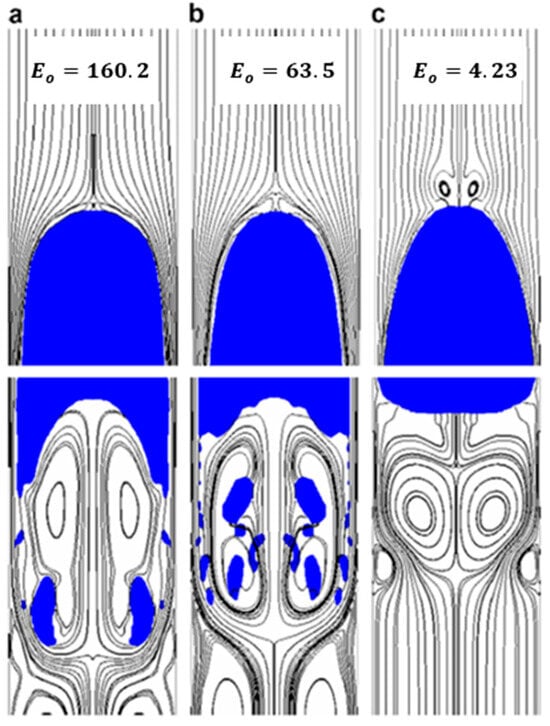 Zheng et al. [23] conducted research on the same dimensionless numbers using computational fluid dynamics (CFD) and related the results to the shape of the Taylor bubble as shown in Figure 4, Figure 5 and Figure 6. The streamlines represent the liquid phase, and the blue bubble represents the Taylor bubble. From Figure 4, it can be observed that the edge of the nose of the Taylor bubble is shaped in the form of an ellipsoid, and the nose becomes less pointed with increasing . The curvature of the tail of the Taylor bubble is convex in (a) and in (b), but it takes a concave shape with a further increase in . The shape of the tail of the Taylor bubble shown in (c) results when the flow is viscosity dominated. From Figure 5, it is observed that the nose of the Taylor bubble becomes sharper with a decrease in , and the tail shape of the Taylor bubble changes from the concave shape to a blunter surface as decreases. The sharpness of the Taylor bubble nose increases with surface tension. A Taylor bubble with a sharper nose has an increased liquid film thickness at the front, reducing the falling film velocity. The velocity of the falling film reduces because the liquid film developing region extends to the nose of the Taylor bubble. Once the liquid film velocity is reduced, the gas can push most of the liquid film to the surface. This will result in a lower fallback. From Figure 6, the shape of the nose of the Taylor bubble remains almost the same throughout, indicating how weakly the value of the Froude number affects the nose of the Taylor bubble. For the range of Froude numbers simulated, the divergence of the streamlines reduces close to the nose of the Taylor bubble with increasing Froude number. This shows less penetration of the Taylor bubble in the liquid phase with increasing Froude number. According to Brill et al. [6], the fallback increases with increasing Froude number for high Froude numbers. However, since there was no variation in the shape of the nose of the Taylor bubble for the range of Froude numbers simulated by [23], we cannot draw any conclusion on how the Froude number affects the nose of the Taylor bubble. Hence, more research using computational fluid dynamics needs to be conducted on the behavior of the nose of the Taylor bubble for higher Froude numbers (values between 20 and 150).
