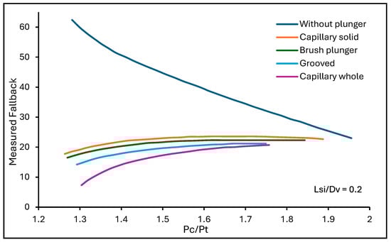 Comparison of fallback with ratio of casing and tubing pressure for with and without a plunger showing the behavior of fallback with and without the plunger for initial slug length-to-valve ratio of 0.2 [27].