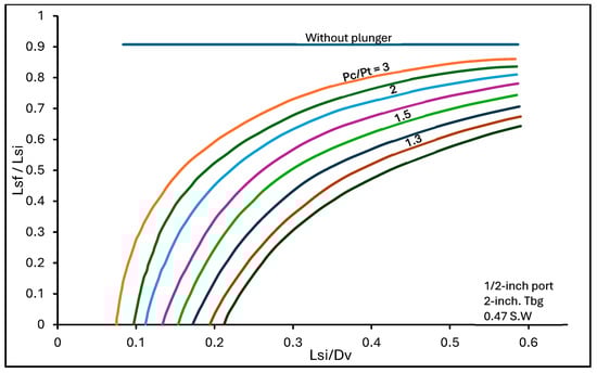White [27] conducted a reduced-scale experiment where fallback in gas lift was studied with and without a plunger. He conducted over 150 test runs, and plunger variations were also made. The results obtained are shown in Figure 7 below. It is observed that the use of the plunger increased the recovery vastly at low casing–tubing pressure ratios. Also, there were observed variations in the behavior of the plungers. Again, he observed that drilling a hole in the center increased the ability of the solid or capillary plunger to effectively propel the liquid. This is because the small hole allows high-velocity gas to pass through, which creates a piston-like nature of gas interface just above the plunger to propel the liquid. White [27] considered a particular intermittent gas lift installation illustrated by Figure 8 with a well depth, varied initial liquid length, and different casing-to-tubing ratios. The result of this study is shown in Figure 9. Despite the changes in the initial slug length-to-depth ratios and casing pressure-to-tubing pressure ratios, the amount of liquid recovered remained almost the same (90%) for when a plunger is not being used, as shown by the blue straight line. White [27] also showed adding a plunger lift to a gas lift reduces the injection gas requirement.
