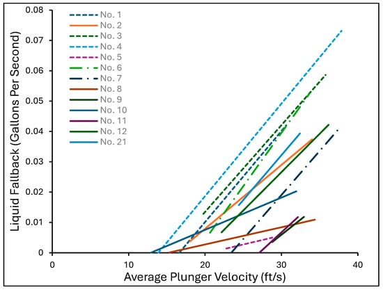 Mower et al. [28] conducted a laboratory study that involved modification of the model proposed by [24] by including liquid fallback and gas slippage for about twelve different plungers. A 735 ft laboratory test well was equipped with four mandrels spaced at about 179 ft intervals from a depth of 715 ft to 179 ft, each with a pressure transducer. They observed that the amount of liquid fallback depends on the plunger velocity. The least square fit of fallback against the velocity of the plunger obtained is shown in Figure 10. From Figure 10, it can be observed that the liquid fallback generally increases with an increase in average plunger velocity. The plunger that had the best behavior with increasing plunger velocity is the one that has the least slope in Figure 10. From Figure 10, it is plunger No. 8, and the plunger type for plunger No. 8 is an expanding blade plunger.