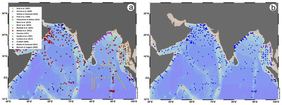 (a) The locations of available core tops, plankton tows, and nets in the northern Indian Ocean. (b) Core top data [43,48,49,50,51,52,53,54,55,56,57,58,59,60,61] were selected following the screening criteria developed in this study to construct spatial maps for five dominant planktonic foraminifera.