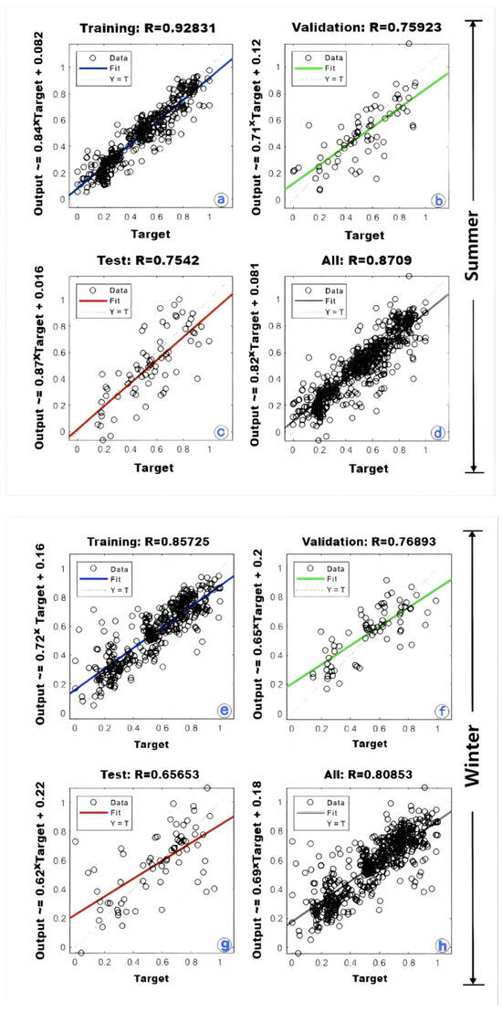 We have used 80% of the foraminiferal census to train the ANN model, and the rest of the data (i.e., 20%) was used for testing and validation, as shown in Figure 4. The model outputs show an excellent coefficient of correlation (R) of 0.928 during the summer, indicating that it performs well on the training set, with a strong linear relationship between predicted and actual values. The R-values between the predicted and actual values are 0.759 and 0.754 for the validation and test sets, respectively, suggesting that the model performs reasonably and satisfactorily compared to the training set (Figure 4). However, the overall R-value is 0.8709 when all the model results are pooled, which is considered good. In contrast to summer, the R-value is lower, i.e., 0.857, for winter. The extent to which factors contribute to a lower R-value for winter compared to summer is unclear. One of the possibilities for a foraminiferal census is a summer bias, such as a high percentage of G. ruber, G. sacculifer, etc., which requires further study and, thus, cannot be resolved at present.