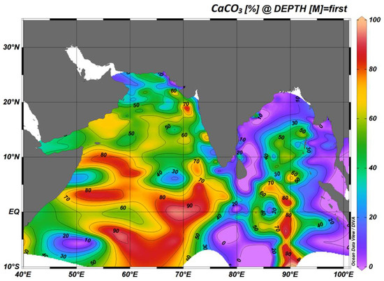Calcium carbonate (%wtCaCO3) concentration of the bulk sediments was plotted to assess carbonate-rich and carbonate-poor regions of the northern Indian Ocean.