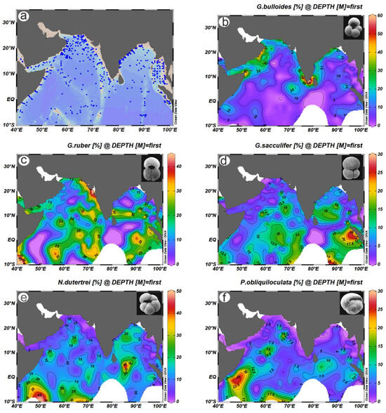 Spatial maps of the five most dominant planktonic foraminiferal species in the northern Indian Ocean. Data (a) from the location of the core top census are used to construct the spatial map shown in (b–f).