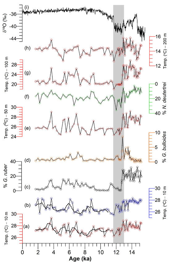 The average winter and summer WCTs at a 10 m depth are 26.60 °C and 27.27 °C, respectively, consistent with a trace concentration of G. bulloides (Figure 7c). However, the % N. dutertrei inversely correlates with the WCT at a 50 m water depth during the Holocene compared to the deglacial period (15.20–12.90 ka), suggesting an enhanced ISM [45]. The enhanced ISM would precondition a freshwater environment, leading to a low-salinity environment in which high-tolerance species, such as N. dutertrei, G. rubescens, G. siphonifera, and G. glutinata, would thrive.