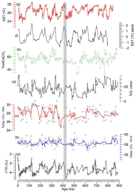(a) Benthic foraminiferal oxygen isotopes (δ18O) in ODP Site 758 [46]. The ANN-calculated water column temperatures (WCTs) at 10 m water depth during (b) winter (blue) and (c) summer (red) using the foraminiferal census [46] from the southern Bay of Bengal Site 758 for the past 890 ka. Benthic foraminiferal (i.e., Cibicidoides wuellerstorfi) oxygen isotopes (a), % G. ruber (d), and calcium carbonate (i.e., %wtCaCO3) (e) data are also plotted from the same interval. (f) Global sea surface temperature (SST) stack [126] and (g) alkenone-derived SST [126] from the western Arabian Sea Site 723 were plotted to compare the WCTs from Site 758. All the records are plotted according to their published age models. Note that the discontinuous lines on (b,c) are the 3-point running average of the WCTs data. Note that the vertical grey bar is also meant to represent the MBE.