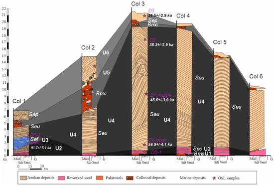 Stratigraphic logs of the study area, La Fortalesa (Pollença, N-Mallorca), modified from [17,21] (OSL samples).