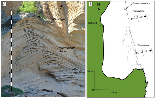 In the study area, the cliff reaches elevations ranging between 22.5 and 23.8 m above the current sea level (Figure 1C). The presence of an abandoned coastal quarry at this site has created a highly favourable setting for sedimentological analysis. The quarry exposures offer clear, three-dimensional views of stratified aeolian deposits, allowing for the detailed examination of facies architecture and sedimentary structures that would otherwise be inaccessible. This exceptional level of exposure makes Punta de l’Avançada a key location for investigating the evolution of coastal cliff-front dunes and provides data for reconstructing the palaeoenvironmental history of the region.