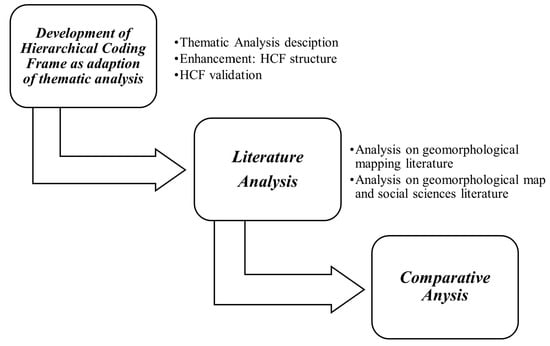 The research is based on the necessity to (i) qualitatively assess the literature about the production of geomorphological maps, (ii) understand their subsequent social use, and (iii) evaluate the instruments used in the “social–geomorphological maps” field. The qualitative analysis was performed through an adaptation of the thematic analysis [37,38,39,40,41,42,43], here called hierarchical coding frame (HCF). Subsequently, to respond to the first two research questions above, the HCF was performed on two different literature samples. Hence, to answer the third question, a comparative analysis was carried out [44,45]. The general workflow is reported in Figure 1.