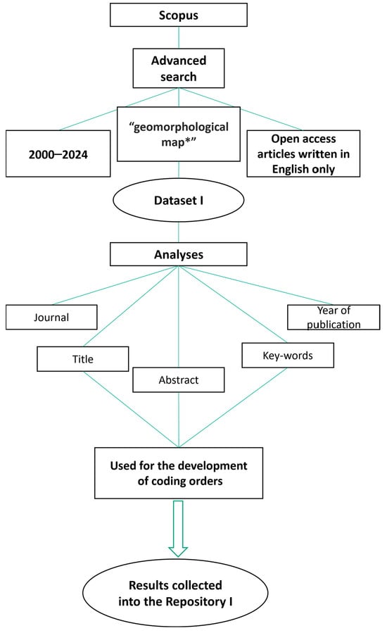 We selected only the English-written articles that span the period from 1 January 2000 to 31 December 2024, following the methodology provided by Quesada-Román and Peralta-Reyes (2023) [36]. However, a modification was made to this methodology, and we decided to use only open-access literature. This choice is justified because, for a qualitative analysis of the literature, it is essential for the researcher to have easy access to the full text. In addition, this choice facilitated the replicability of the analysis. In addition, consultation of Table 2 [47,48] was used to determine that the analysis of the open-access literature alone was sufficiently representative of the entire sample returned by the unrestricted query. We used the following query: ‘Scopus: TITLE-ABS-KEY ((geomorphological map*)) AND PUBYEAR > 1999 AND PUBYEAR < 2025 AND (LIMIT-TO (OA, ‘all’)) AND (LIMIT-TO (DOCTYPE, ‘ar’)) AND (LIMIT-TO (LANGUAGE, ‘English’))’.