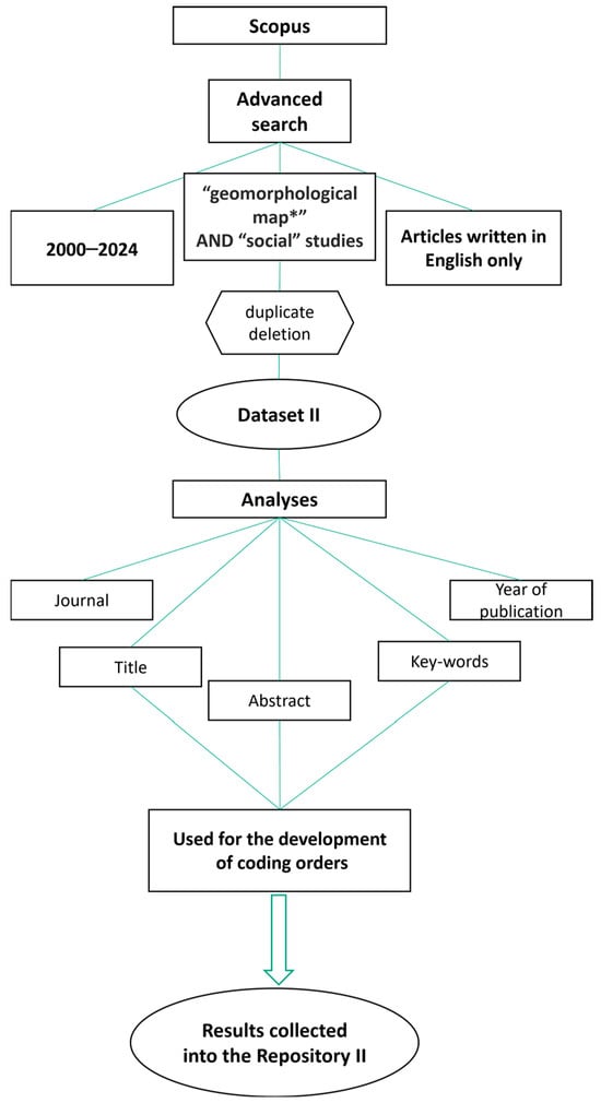 To answer our second research question, the second phase of research is exclusively related to scientific articles that addressed the advancement of geomorphological mapping for social applications. Furthermore, to ensure the greatest possible representativeness of the analysis, both open-access and articles under embargo were included at this stage. The used query was TITLE-ABS-KEY (‘geomorphological map*’ AND ‘social’) AND PUBYEAR > 1999 AND PUBYEAR < 2025 AND (LIMIT-TO (LANGUAGE, ‘English’)) AND (LIMIT-TO (DOCTYPE, ‘ar’)). The choice of the Boolean operator AND is justified by the need to keep both subjects together. In fact, in Scopus, the AND operator allows two or more words to be linked. In this way, the database returns all the indexed documents that contain all the entered words, not just one of them. Some articles obtained from the second query used (‘TITLE-ABS-KEY (‘geomorphological map*’ AND ‘social’) etc.) were also included in the previous search conducted with the query ‘Scopus: TITLE-ABS-KEY (((geomorphological map*))’. This overlap is justified by the fact that the second query represents a specification of the first, focusing on articles that include the term social. Consequently, open-access and English-language articles that meet the conditions of the first query are also automatically included in the results of the second query, which adds a more specific thematic filter. Hence, before performing subsequent analyses, all items already in the dataset were removed from the Excel spreadsheet to prevent duplicate items from being analysed a second time.