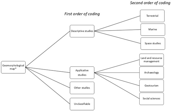 Instead, our work, through an adaption of the thematic analysis by Braun and Clarke (2006) [37], here indicated as hierarchical coding frame (HCF), focuses primarily on analysing the content of a sample of articles, identifying emerging trends, evaluating interdisciplinarity with the social sciences, and suggesting new research perspectives in the field of geomorphological mapping. This study, considering its potential integration with the existing bibliometric analysis within the existing literature, could facilitate a more comprehensive understanding of the current state of the art in the literature on geomorphological maps.