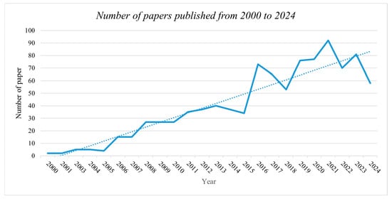 The analysis revealed a general increase in the production of articles about geomorphological maps. The graph in Figure 6 illustrates the general trend derived from a temporal analysis of Dataset I, which the authors selected as the only one in this paper that could be considered consistently comparable with the analysis proposed in the study conducted by Quesada-Román and Peralta-Reyes (2023) [36].