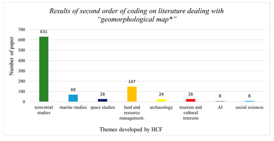 To enhance the qualitative comprehension of the articles belonging to Dataset I, a second coding scheme was devised for all articles falling within the initial two categories. A second coding order was then developed for 939 articles, 727 of which were assigned to the category descriptive studies and 212 to the category applicative studies. From here, the HCF methodology was employed to develop eight main themes useful for the qualitative description of all scientific papers under analysis. In the descriptive studies, three key themes were identified: terrestrial studies, marine studies, and space studies. In the applicative studies, the themes include archaeology, land and resource management, tourism and cultural interests, artificial intelligence, and social sciences. A brief overview of the development of the theme is shown in Figure 8.