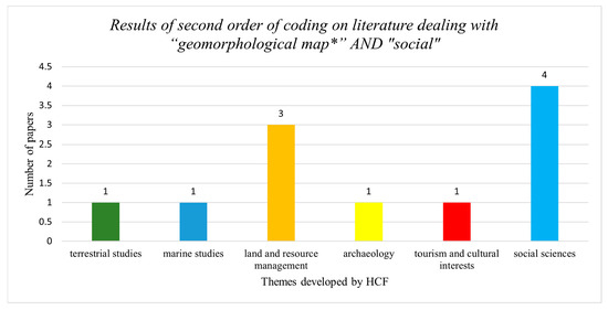 The results of the comprehensive review derived from the articles included in Dataset I suggest that ‘social science’ is the most underrepresented topic in the geomorphological mapping literature when considering the annual distribution of literature production. To substantiate this evidence, a second search was conducted, encompassing all available literature and focusing on articles pertaining to both geomorphological and social science mapping. The additional literature search on Scopus (performed in February 2025) resulted in a new dataset, called Dataset II. It consisted of 11 articles that underwent qualitative analysis using the HCF methodology applied twice.