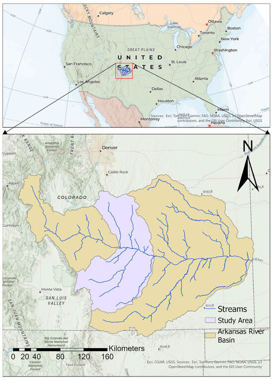 The Arkansas River originates in the Rocky Mountains and flows about 640 km through Colorado, supporting agriculture, municipalities, and industry [35]. Extensive modeling efforts in different sections of this basin have addressed issues like flow and salt transport [36], selenium and nitrogen contaminant dynamics [37,38], salinity [34,39], and groundwater–surface water interactions [40,41]. The study area is approximately a 15,900 km2 portion of the Arkansas River Basin in the state of Colorado in the Western USA. Figure 1 displays the location of the study area within the USA (indicated by a red rectangle), along with a zoomed-in view of the Arkansas River Basin highlighting the selected study area. This region experiences a semi-arid climate, receiving an average annual precipitation of roughly 360 mm.