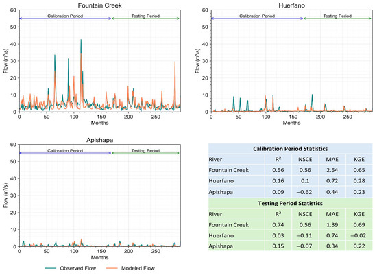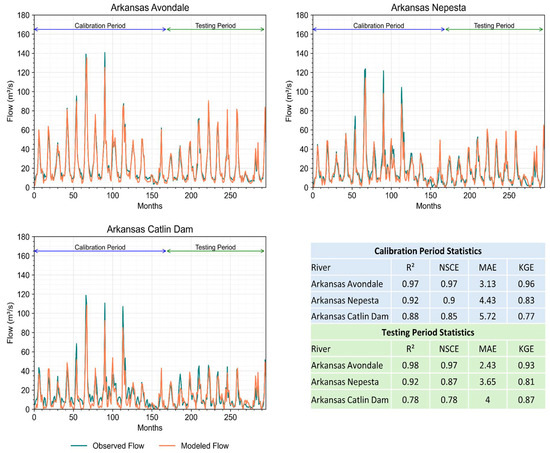 Figure 4 illustrates the comparison between observed and modeled mean monthly flows at Avondale, Nepesta, and Catlin Dam along the Arkansas River. The x-axis represents the months from January 1990 to July 2014, and the y-axis represents the flows in cubic meters per second (m3/s). The calibration period for the model is from 1990 to 2003, and the testing period is from 2003 to 2014. Goodness of fit (R2), Nash Sutcliffe Coefficient of Efficiency (NSCE), Mean Absolute Error (MAE), and Kling Gupta Efficiency (KGE) show that the model is performing well in both the calibration and testing periods in terms of flow prediction along the Arkansas River.