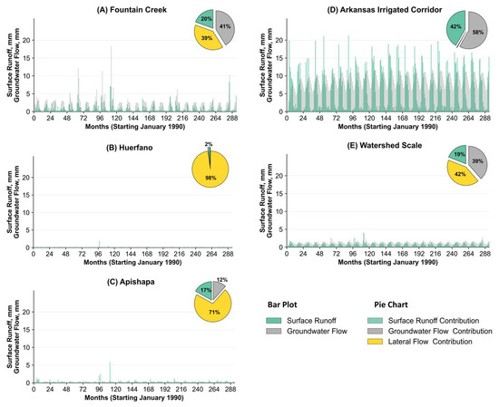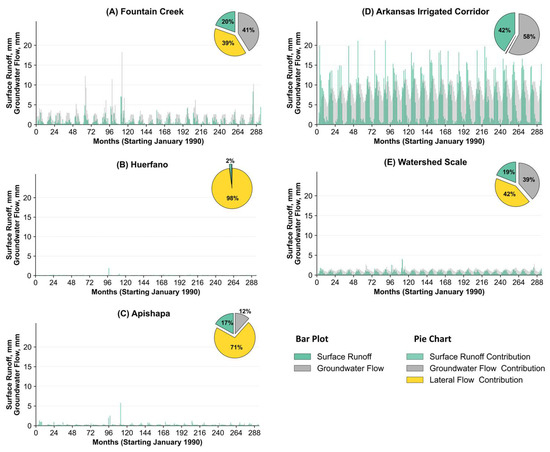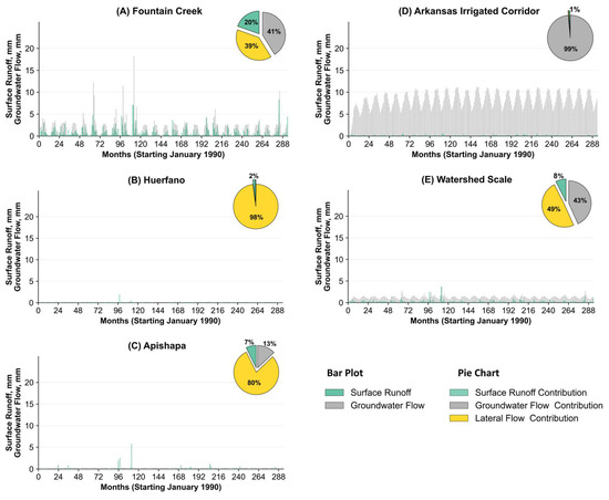 Similarly, in the Fountain Creek subwatershed, both groundwater (41%) and lateral flow (39%) play major roles, suggesting a more balanced hydrologic regime with substantial contributions from both saturated and unsaturated zone processes. In contrast, the Apishapa and Huerfano subwatersheds exhibit minimal groundwater contributions but high lateral flow dominance, indicative of active water movement through the root zone in less irrigated or upland areas. At the broader watershed scale, streamflow composition—42% lateral flow, 39% groundwater return, and 19% surface runoff—highlights the importance of interflow processes and root zone dynamics in shaping the overall flow regime. These trends are consistent with hydrograph separation studies and recent groundwater modeling efforts that emphasize the delayed but sustained impact of subsurface return flows, particularly in semi-arid irrigated basins of the western USA [54].