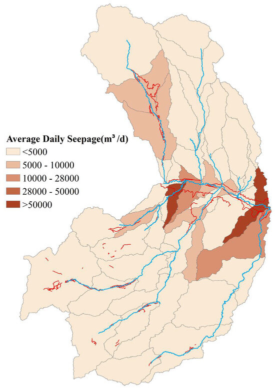 Figure 7 illustrates the average daily seepage (m3/day) across the study area during the modeling period. The highest seepage rates (>50,000 m3/day) are observed along the irrigated corridor of the Arkansas River, where major water diversions occur by the canals shown by red lines, and most irrigated fields are concentrated. The blue lines represent the rivers in the study area. This suggests that the irrigated corridor functions as a significant recharge zone. Refs. [50,55] report seepage through canals in the Arkansas River Basin to be 0.01 to 0.14 m3/s/km of canal length which converts to 864 m3/day to 12,000 m3/day per kilometer length of canal. The discharge rates simulated by the model in this study are comparable to these observed values.