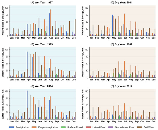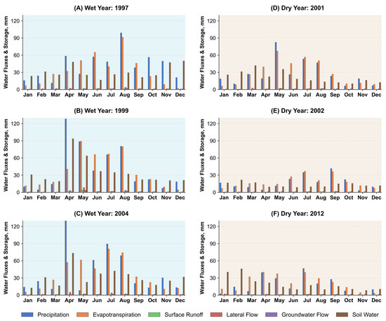 Even though the monthly distribution of fluxes differs noticeably between wet and dry years at the watershed scale, as shown in Figure 9, Table 5 indicates that the average surface runoff (8 mm in wet and 7 mm in dry years) and groundwater return flow (16 mm in the wet years vs. 14 mm in the dry years) are not drastically different between the two-year types. In contrast, evapotranspiration (431 mm in wet years vs. 298 mm in dry years) and precipitation (495 mm vs. 266 mm) are significantly higher in wet years.
