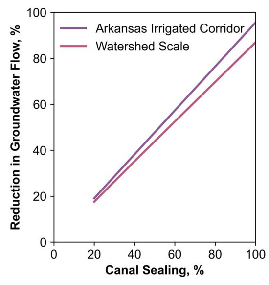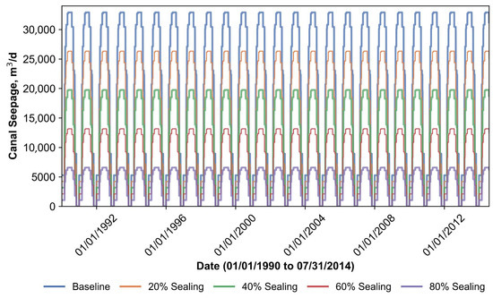 As shown in Figure 6, the canal seepage is mostly high along the irrigated corridor of the Arkansas River; in this section, we present the impacts of canal seepage along the irrigated corridor only. Figure 12 presents the trend of canal seepage (m3/d) over the modeling period under different levels of canal sealing (0% to 80%). Canal seepage exhibits a recurring seasonal trend, with peaks occurring annually. This suggests that canal seepage is strongly influenced by seasonal irrigation demands and water availability in the canals. The baseline (0% sealing) scenario has the highest canal seepage. As canal sealing increases (from 20% to 80%), seepage progressively decreases. The 80% sealing scenario (purple line) shows the lowest seepage rates, confirming that sealing canals significantly reduces water loss due to seepage. Each step of increased canal sealing leads to a clear, proportional reduction in seepage. Even partial sealing (e.g., 20% or 40%) leads to noticeable reductions, while higher levels of sealing (60–80%) drastically cut seepage losses. As shown in Table 7, groundwater return flow in the irrigated corridor decreases significantly from 108 mm under baseline conditions to 46 mm with 80% canal sealing—nearly a 60% reduction in its contribution to streamflow. However, since irrigation water is primarily diverted from the Arkansas River, with a flow that is regulated by the Pueblo Reservoir just upstream of the study area, most of this seepage source is the upstream release. With canal sealing, less water is needed to offset seepage losses, allowing the reservoir to retain and release that water later to support the flow in the river that would usually come as groundwater return flow from the irrigated corridor. As a result, downstream flows remain largely unaffected despite reduced groundwater return flow within the corridor.