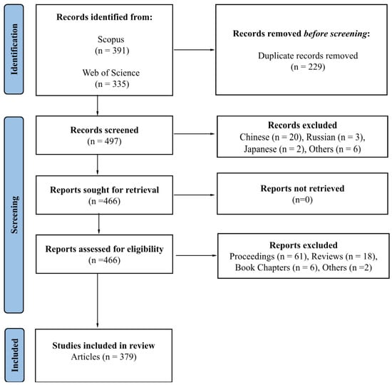 - In the identification phase, 726 records were retrieved, 391 of which came from Scopus and 335 from the Web of Science. Subsequently, 229 duplicate records were removed, resulting in 497 unique records.