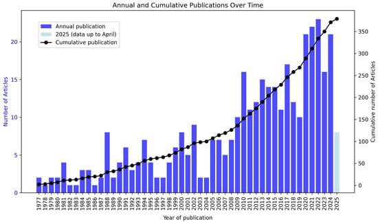 - It is important to note that no documents were classified as “not retrieved” (reports not retrieved = 0). The bibliometric approach adopted in this study based the analysis exclusively on the metadata exported from the selected databases. Therefore, it was not necessary to access the full texts of the articles, as no detailed content assessment was performed. Consequently, 466 records were retained for further evaluation.