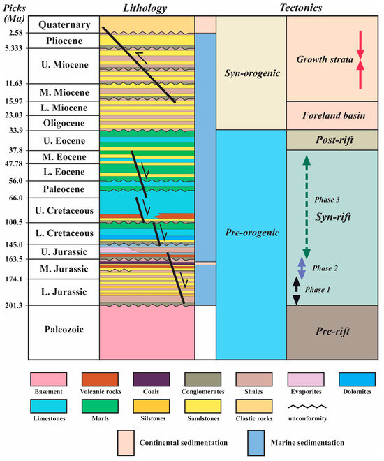 Based on its tectonic evolution, the RFB is divided into pre-orogenic and syn-orogenic sequences [3]. The sedimentary cover comprises a succession of marine (Jurassic–Pliocene) and continental (Quaternary) deposits, with a total thickness exceeding 4–6 km [3,15]. The stratigraphy of the RFB is illustrated in a tectonostratigraphic chart (Figure 3).