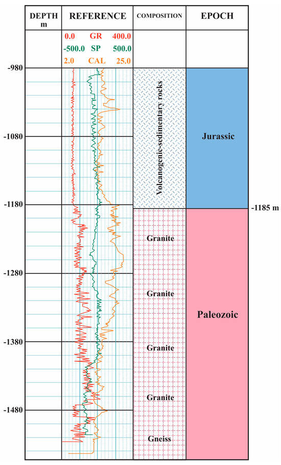Figure 4. MKH–1 drilling target, showing composition, Gamma Ray (GR), Spontaneous Potential (SP), and Caliper (CAL) logs (fragment) [30]. Location is shown in Figure 2.