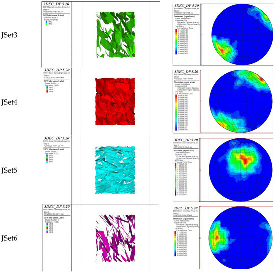 The illustration of DFN generated for the six joint sets and the related stereonets from the numerical simulation.