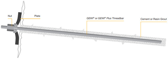 After generating the ten discrete fracture networks, the boundary conditions applied and the cavern excavated are studied. In this study, a typical fully grouted rock bolt from the well-known GEWI® brand, named GEWI Threadbar (Figure 3), along with shotcrete and steel mesh, is used for the support system. The detailed physical and mechanical properties of the rock bolts, shotcrete, and steel mesh are presented in Table 3. The table includes the nominal diameter, steel grade, ultimate strength, yield strength, cross-sectional area, second moment of inertia, reinforcement stiffness, weight, square anchor plate dimension for rock bolts, Poisson’s ratio, uniaxial compressive strength, shear modulus, and Young’s modulus for the injected grout and applied shotcrete.