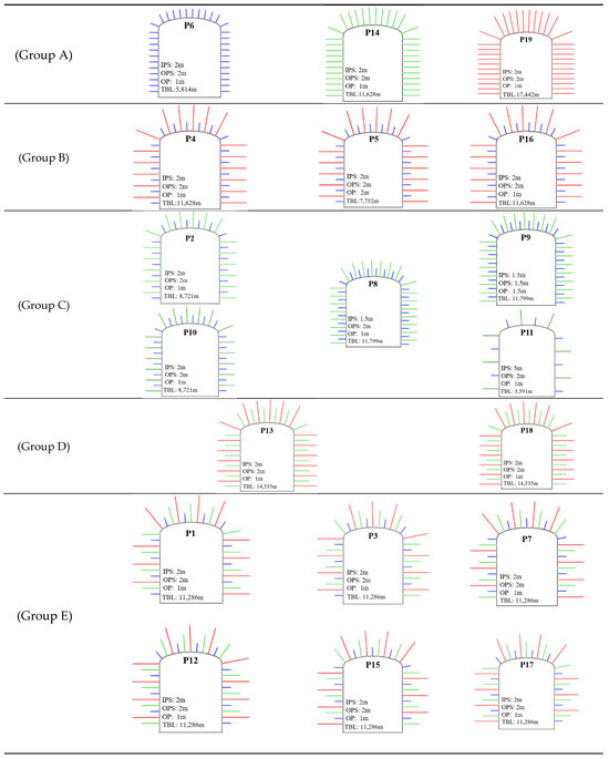 The 19 rock bolt support pattern details considered in the study. (A) Single length pattern. (B) dual rock bolts length form out of 3 and 9 m. (C) dual rock bolts length form out of 3 and 6 m (D) dual rock bolts length form out of 6 and 9 m. (E) triple rock bolts length form out of 3, 6, and 9 m. IPS: in-plane spacing, OPS: out-of-plane spacing, OP: offset from portal, TBL: total bolt length.