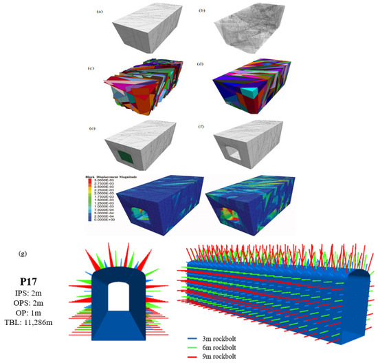 The unstable block zones for the most stable (left) and unstable (right) DFN realization, The generated DFN regularized discrete rock mass; (a–f) present the steps of the excavating tunnel in DFN blocks along with the displacements induced in the fractured network before the support installation (g) presents a sample pattern (P17) generated with three rock bolt lengths.
