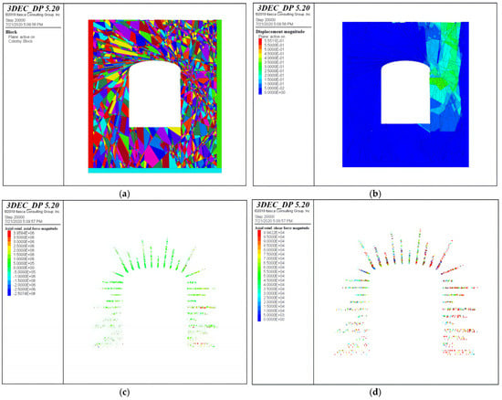 (a) The generated DFN7 with the applied support pattern (P17); (b) the displacement magnitude; (c) axial force distribution magnitude; (d) shear force distribution magnitude.