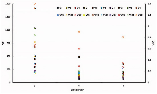 Figure 9 illustrates the VT and V90 values for the equal bolt length patterns with 3, 6, and 9 m rock bolts. It is observed that an increase in the rock bolt length from three to six significantly decreases the total volume and size of the unstable blocks. However, a slight reduction is experienced by increasing the bolt length from 6 to 9 m. This reveals that the increase in bolt length after a specific length does not necessarily increase the stability of a structure in the jointed rock mass.