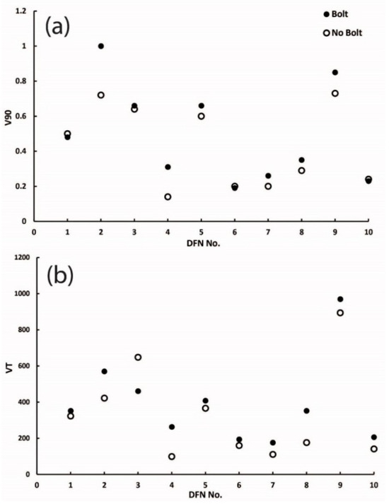 (a) The volume of which 90% of unstable blocks are smaller (V90) and; (b) the total unstable volume (VT) variations against the ten DFN realizations for supported and unsupported sections.