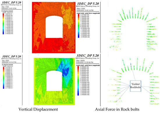 Vertical displacement and axial force distribution in rock bolts implementing the best pattern P12 (top) and the worst pattern P5 (bottom).
