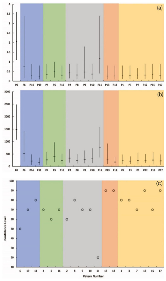 Considering the number of stabilized DFN realizations obtained by the supporting patterns, Figure 12c illustrates the confidence level provided by each bolting pattern. According to the graph, pattern 11 has the lowest confidence level. This is due to its highest longitudinal spacing and the least total length of used rock bolts. The next pattern with the total length is pattern 6, which has a 50% confidence level. Patterns 2 and 5 have a 13% difference in bolt usage and deliver a 60% confidence level. To provide a 70% confidence level, patterns 4, 7, 9, 10, 15, and 16 can be utilized. Among these, pattern 10 has significantly lower (−30%) bolt consumption. With the same bolt length installation as the previous pattern group, 1, 3, 8, and 14 may provide 80% confidence. The highest confidence level is reached via patterns 12, 13, 17, 18, and 19, with a significantly high difference in bolt usage (up to 55%). Patterns 12 and 17 are the lightest. Unlike other patterns in this group, which have single or dual lengths, these two patterns have triple-length bolts. This shows that the total bolt length is not the only factor in selecting the most effective pattern. The bolt arrangement must also be considered.