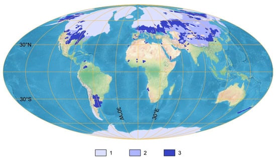 Global extent of Pleistocene glaciations and permafrost. (1) Extent of Pleistocene glaciations (after Batchelor et al. [34], Davies et al. [35] and Bentley et al. [36]); (2) Extent of Pleistocene permafrost in northern hemisphere; after Lindgren et al. [37]; (3) Worldwide loess distribution after Börker et al. [30].