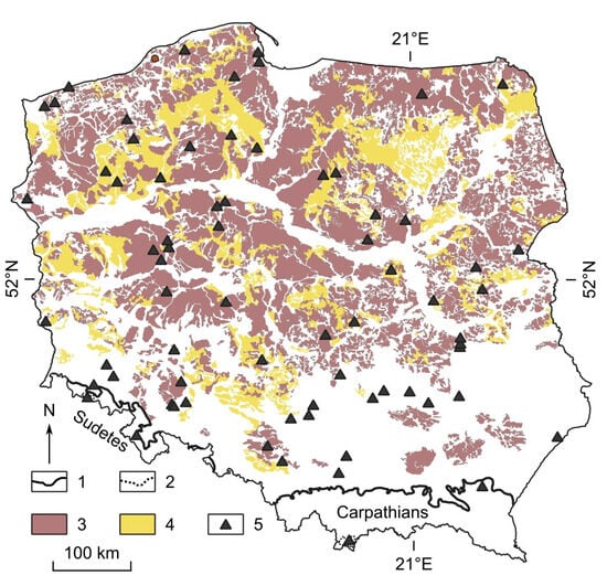 Extent of the Pleistocene glaciations, moraine plateaus and outwash plains in Poland. (1) Southern limits of Pleistocene glaciations; (2) Pleistocene mountain glaciers; (3) Moraine plateaus; (4) Outwash plains; (5) Study areas of research papers published in Polish and/or not included in Scopus and Web of Science databases.